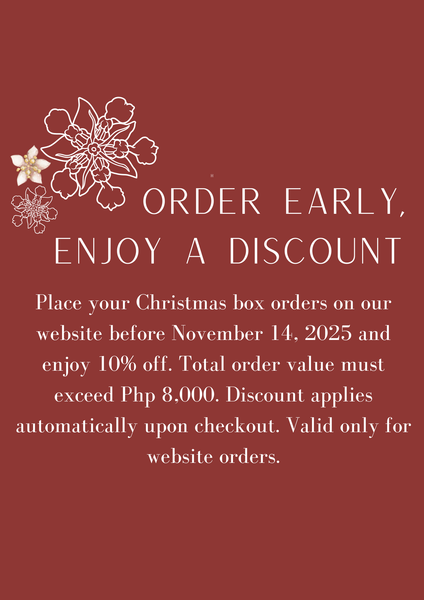 Place and your Christmas box orders on our website and pay for them before November 14, 2025 and enjoy 10% off. Total order value must exceed Php 8,000. Discount applies automatically upon checkout. Valid only for website orders.